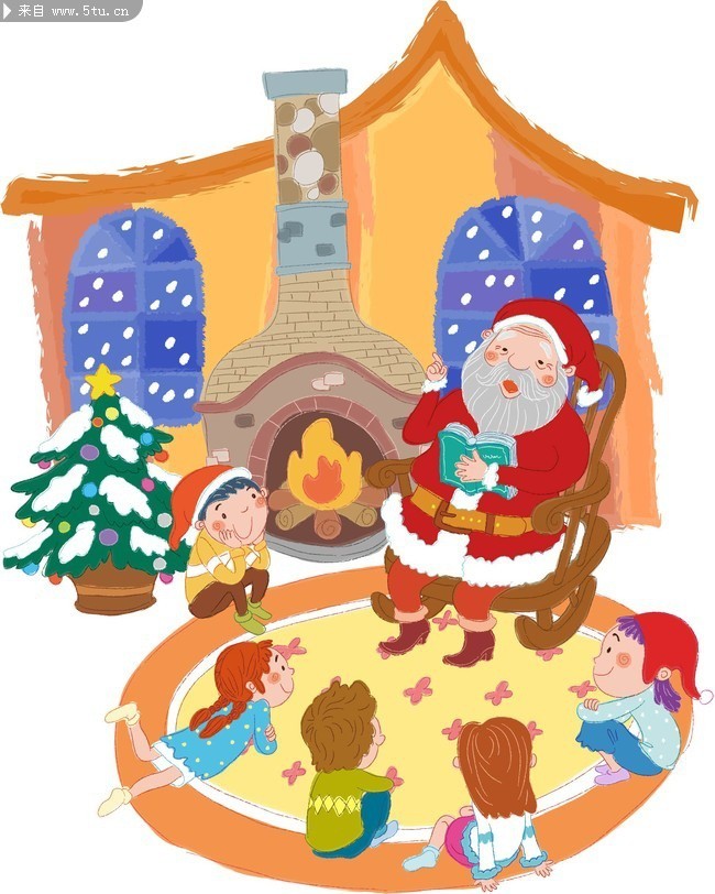 【描 述】圣诞老头与小朋友听故事相关内容,图中包含老人讲故事、小孩子,类似主题有屋子等。