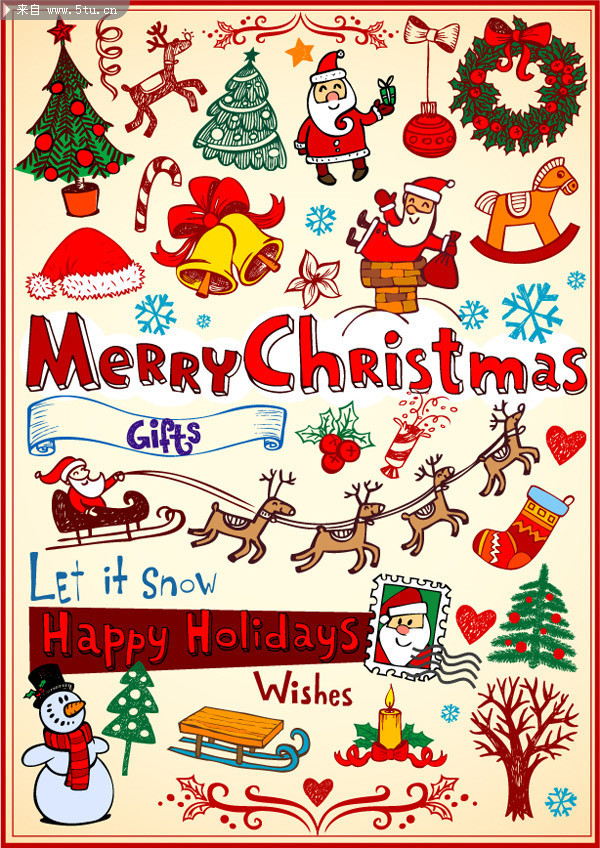 【描 述】圣诞节手绘素材与手绘插画相关内容,图中包含圣诞树、圣诞元素、手写圣诞快乐英文艺术字、圣诞老人拉雪撬,类似主题有圣诞袜等。