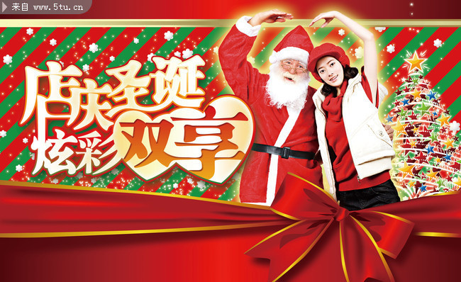 【描 述】圣诞店庆海报与圣诞人物图片相关内容,图中包含圣诞节背景、蝴蝶结、吊旗模板,类似主题有周年庆等。